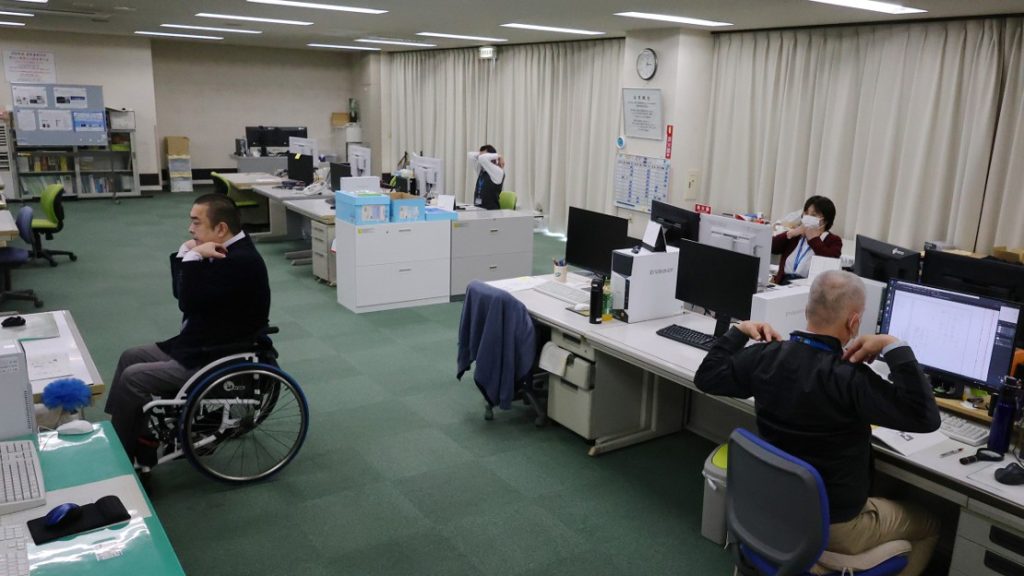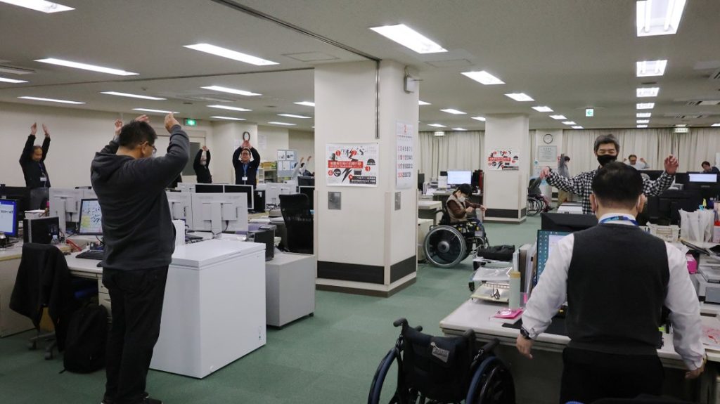 ラジオ体操専門講師を招き本気で行うラジオ体操第一、ラジオ体操第二の講習会を全社員が受講。全社員で始業時にラジオ体操第一、午後の業務開始時にラジオ体操第二を実施している。また、車椅子ユーザーも15名勤務していることから、15:00のストレッチ体操では座ってできるストレッチを選択して実践中。
