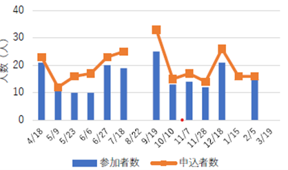 申込者数および参加者数は上図の通りである。天候や時期によってばらつきはあるものの、人数は比較的安定していることから、地域の子どものスポーツ実施者の増加および実施頻度の向上に一定程度寄与したと思われる。また、親や補助の大学生、教職員とも触れ合うなど、多様なカテゴリーに対して運動・スポーツの機会を提供できていると思われる。【運営のポイントおよび横展開の可能性】