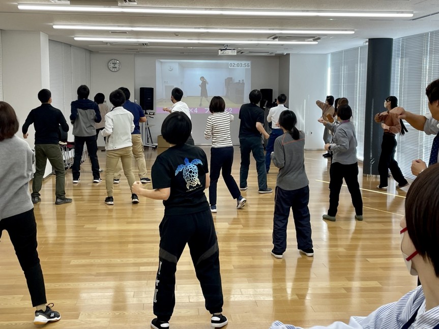 週1回、昼休みに15分程度のエクササイズや筋トレを実施することで、スポーツする時間がとれない職員にも気軽に運動する機会を提供する。
