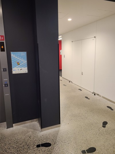 エレベーターホールに階段利用時とエレベーター利用時の消費カロリーやかかる時間を比較するポスターを貼り、通路に足跡のシールを張って階段に誘導するなど、積極的な階段利用を促す。