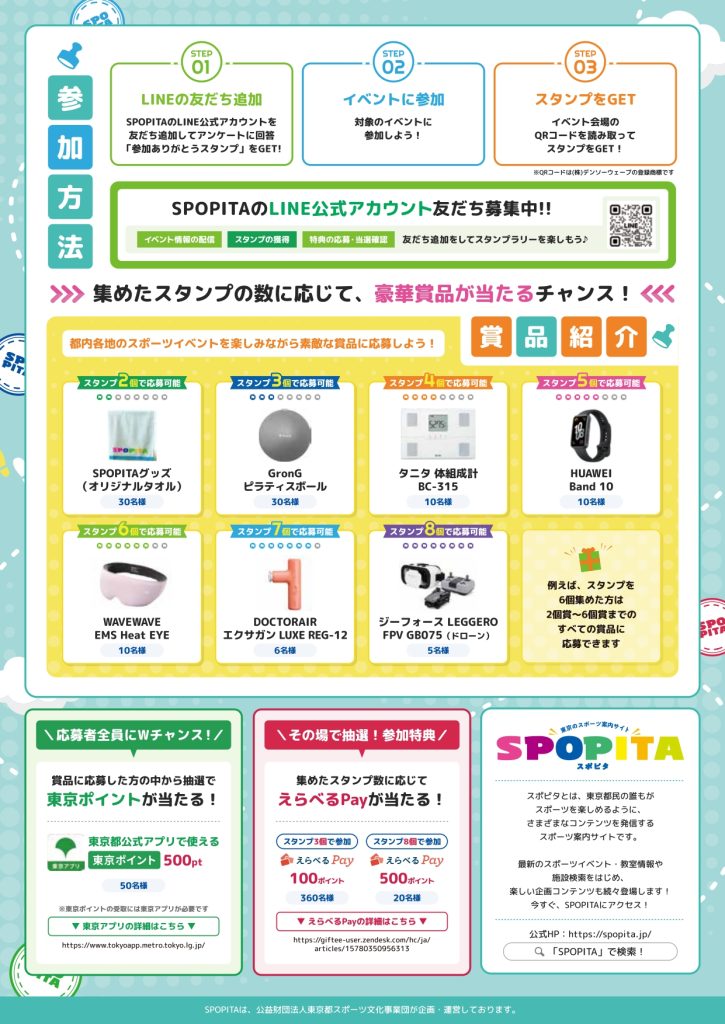 今年で4回目の開催となる「SPOPITAスタンプラリー2025」は、都民の皆様が複数のスポーツイベントに楽しく回遊していただけるよう、スポーツイベントへの参加でデジタルスタンプを集めることにより、抽選で豪華賞品が当たる期間限定キャンペーンです。