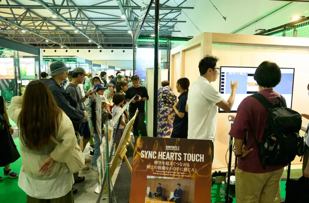 会場内で特に注目を集めたのが、畳の茶室空間に入り、心拍計を装着して一体感を体験する「SYNC HEARTS BOX」です。スポーツ庁が「Sport in Lifeプロジェクト」の一環として出展したこの体験ブースは、心拍のリズムが周囲と同調していく”心拍同調”の仕組みを活用して、茶道の”一座建立”の精神を最新技術で再現しました。