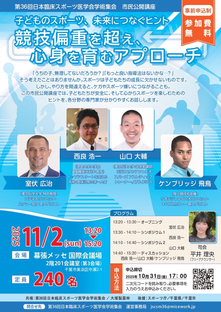 公開講座は、参加費無料で会員も会員以外の方も参加できますので、お誘いあわせの上、ぜひ、ご参加いただければと思います。●市民公開講座①: 日 時:11月2日(日)13:20~15:20 場 所:幕張メッセ国際会議場 2階「201会議室」 テーマ:競技偏重を超え、心身を育むアプローチ 登壇者:室伏 広治先生、西良 浩一 先生、山口 大輔 先生、ケンブリッジ飛鳥氏 ●市民公開講座②: 日 時:11月3日(月・祝)13:10~14:55 場 所:幕張メッセ国際会議場 2階「201会議室」 テーマ:スポーツで健康な日本をつくろう! 登壇者:鈴木 大地 先生、大野 雅史 先生、門脇 俊 先生、中島 亮一 先生 市民公開講座申し込みホームページ:以下のURLより申し込みください。 https://www.36rinspo.jp/public_lecture.html 第36回日本臨床スポーツ医学会学術集会ホームページ
