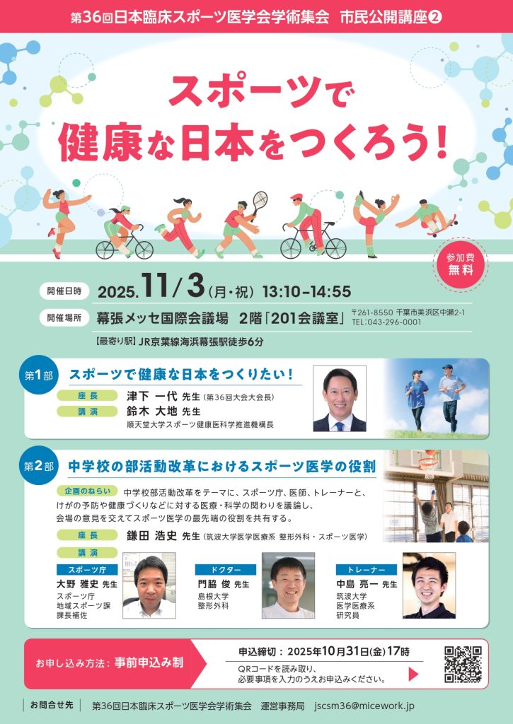 - 第36回日本臨床スポーツ医学会学術集会 市民公開講座開催のお知らせ(11月2日(日)-3日(月・祝)@幕張メッセ国際会議場)