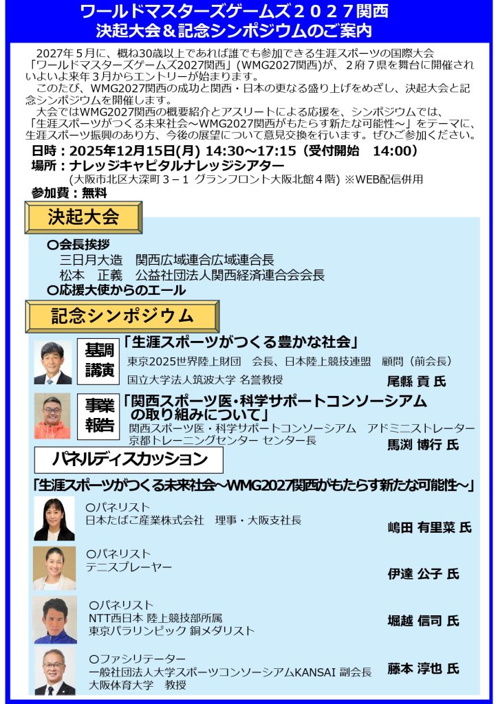 「ワールドマスターズゲームズ2027関西」(WMG2027関西)が、2府7県を舞台に開催され、いよいよ来年3月からエントリーが始まります。このたび、WMG2027関西の成功と関西・日本の更なる盛り上げをめざし、決起大会と記念シンポジウムを開催します。