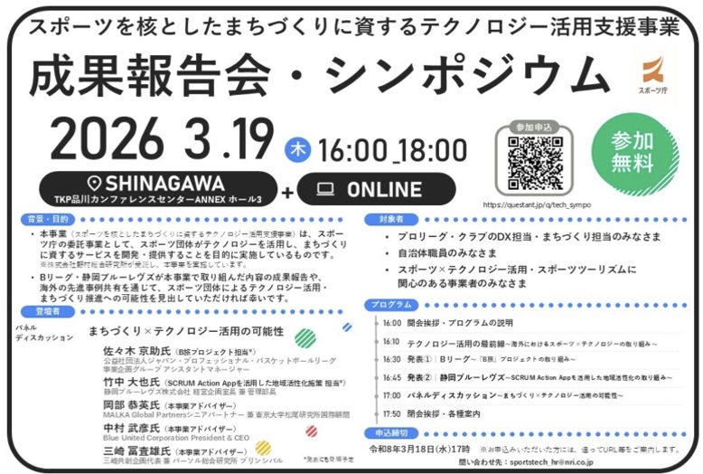 - 2026年「スポーツを核としたまちづくりに資するテクノロジー活用支援事業 成果報告会・シンポジウム」開催のお知らせ