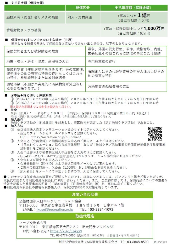 そこで、日本レクリエーション協会では、AIG損保と検討・協議を重ね、この令和8年度に合わせて任意団体も加入可能な「地域クラブ活動事業者賠償責任補償制度」を創設しました。