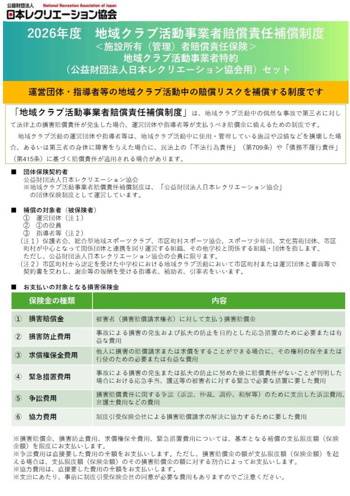 (公財)日本レクリエーション協会では、任意団体でも加入できる「地域クラブ活動事業者賠償責任補償制度」を新たに開始しました。